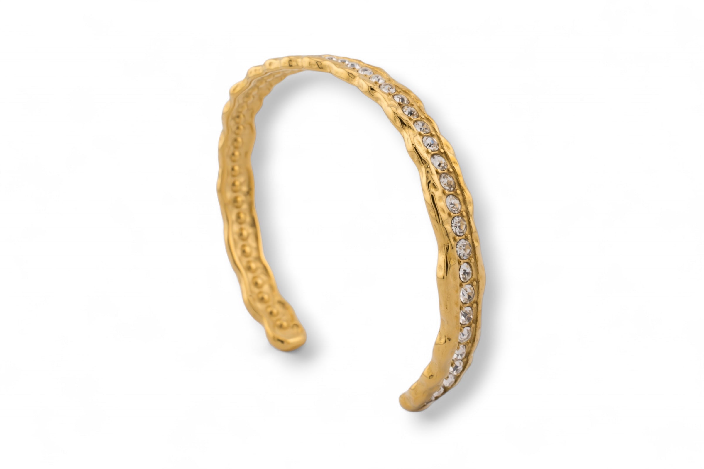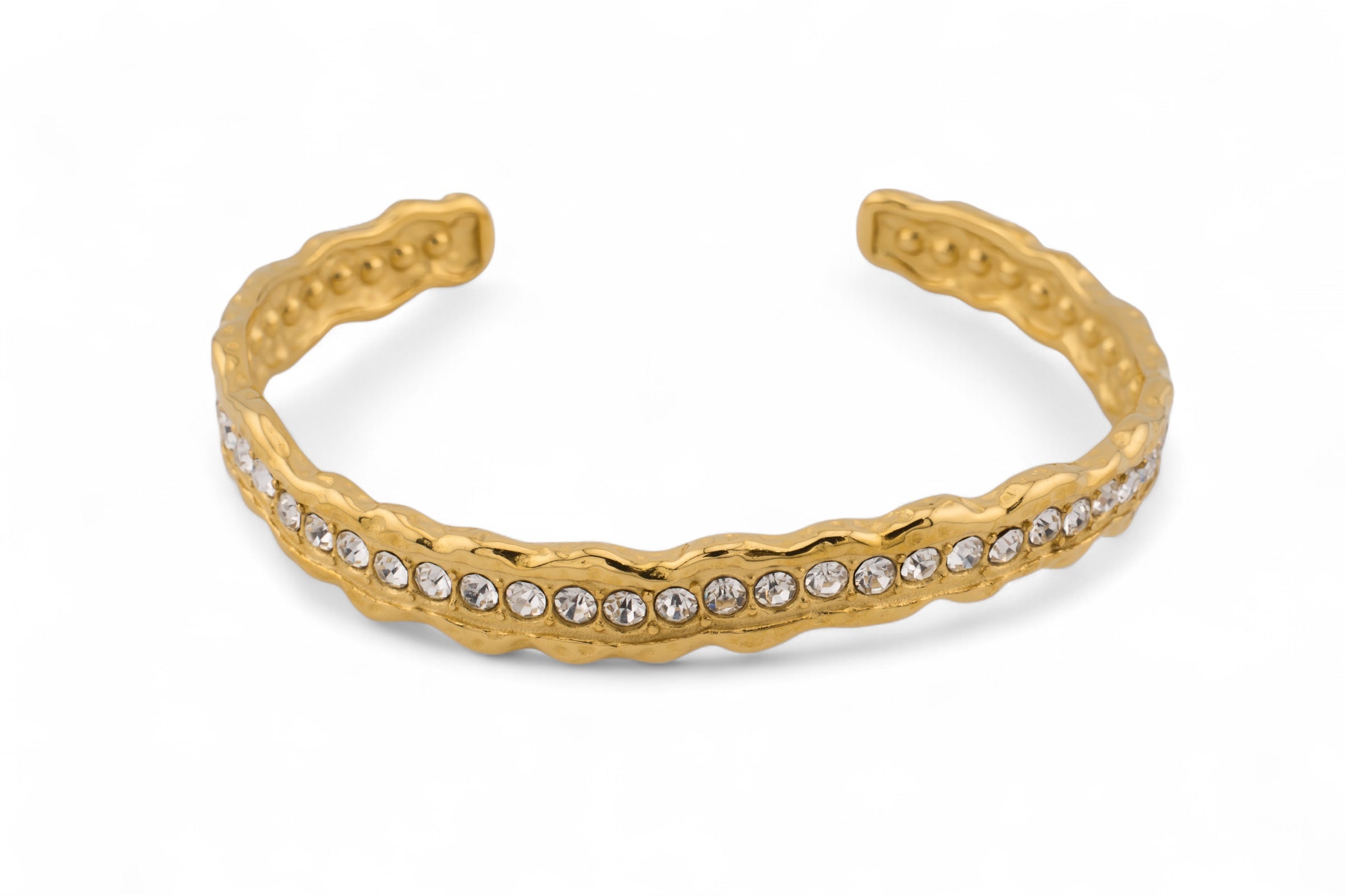 Adjustable 18K gold-plated stainless-steel cuff bracelet ring with engraved cubic zirconias