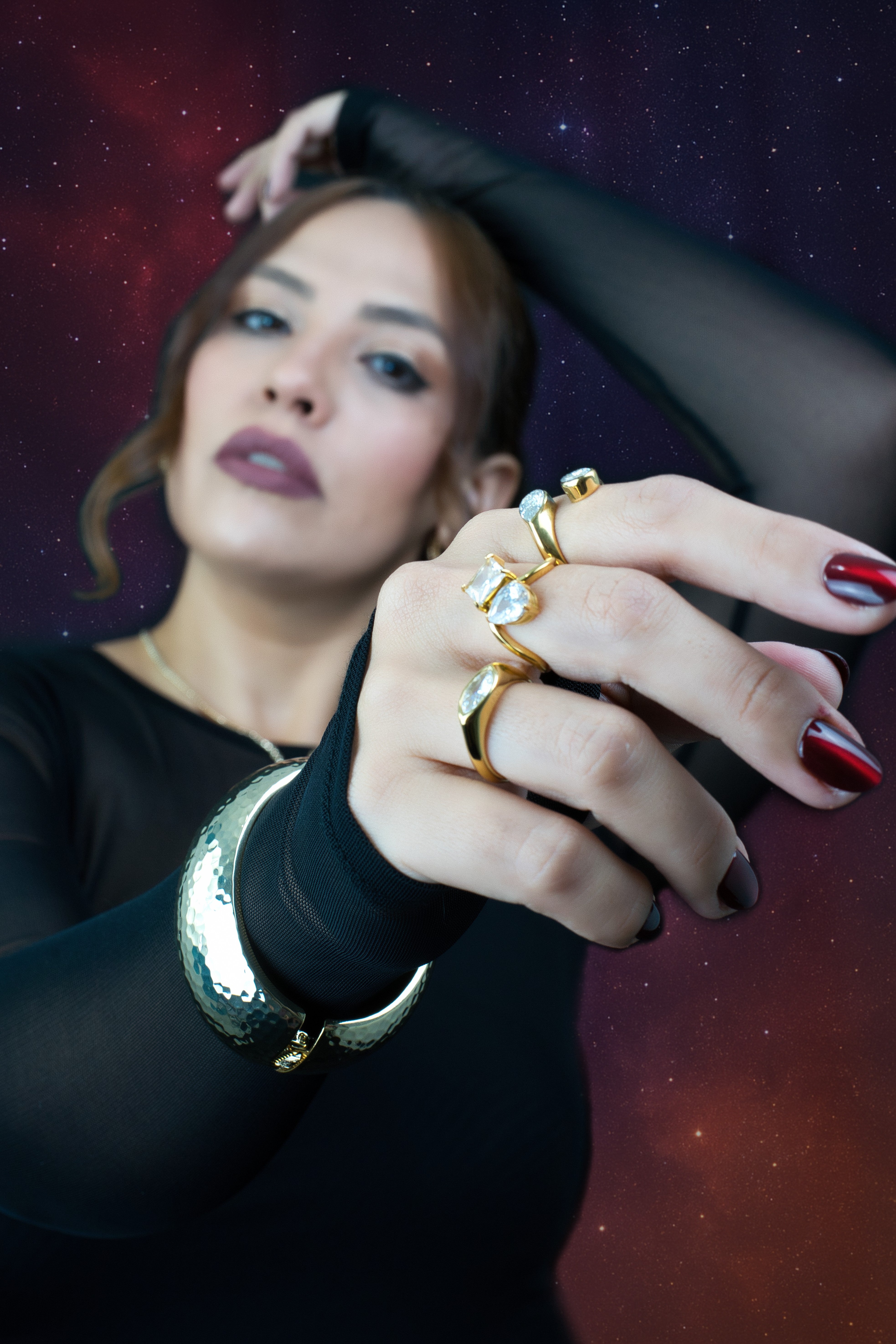 The Twilight Before Time Ring is inspired by the mysterious moment before the universe began, when all matter, energy, and light were compressed into a single point of infinite potential. Scientists call this the pre-Big Bang state, a timeless twilight before the birth of spacetime itself. Its asymmetrical design, pairing two luminous zirconias of distinct shapes, reflects the duality between darkness and light. Crafted in gold-plated stainless steel and zirconias, Twilight Before Time symbolizes the beauty of beginnings. The quiet pulse of creation that existed even before time had a name.